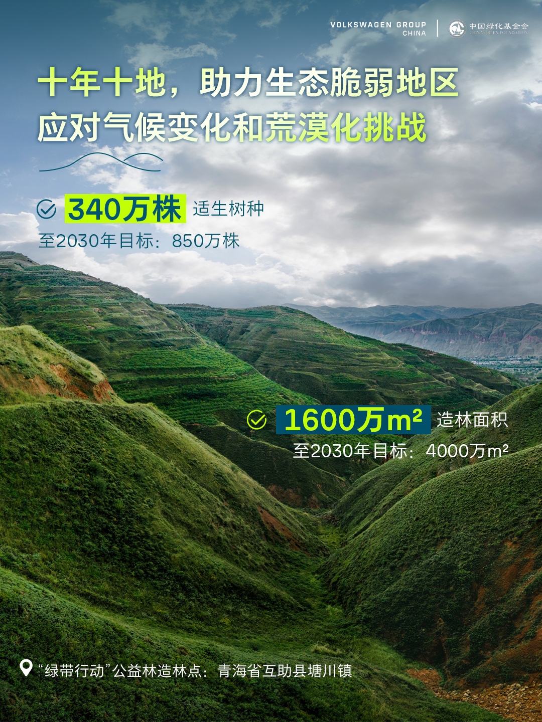 荒漠化和土地退化是全球面临的共同挑战,影响着全球近40%的土地。在中国,荒漠化仍是当前面临的重大生态问题,需要汇集更多社会力量共同开展治理行动。“绿带行动”—大众汽车集团(中国)公益林项目实施四年来,已为四个受荒漠化影响的地区种植超340万棵树,生态修复近1600万平方米沙化土地,惠及28万受风沙影响的居民,助力中国实现荒漠化和沙化土地“双缩减”、在全球范围内率先实现了土地退化“零增长”的目标,为各个面临荒漠化危机的国家和地区提供了有益的借鉴和参考。