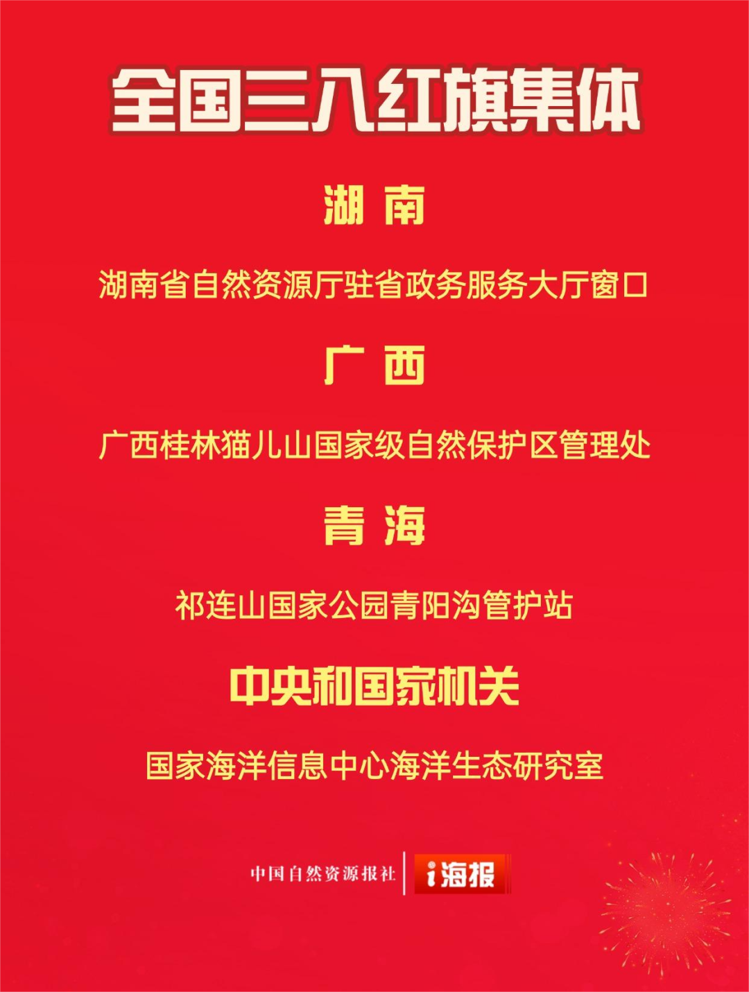 被授予全国三八红旗集体称号的4个单位,分别是:湖南省自然资源厅驻省政务服务大厅窗口、广西桂林猫儿山国家级自然保护区管理处、青海祁连山国家公园青阳沟管护站、国家海洋信息中心海洋生态研究室。