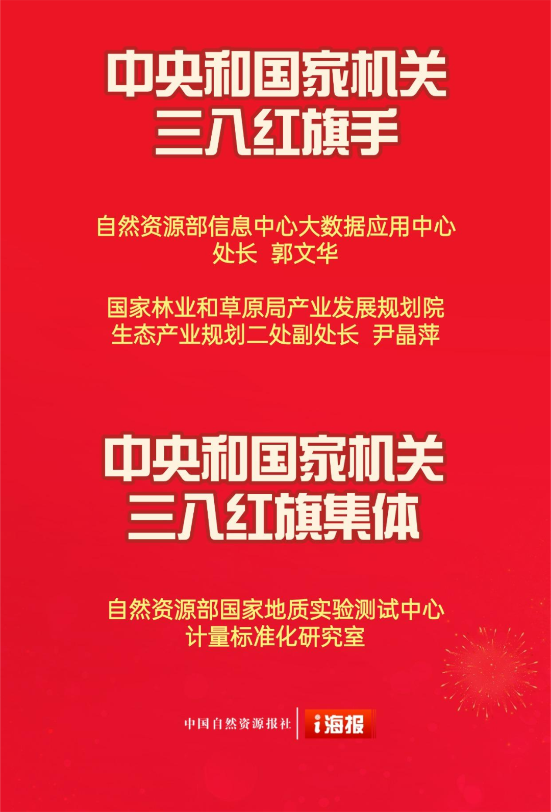 同时,中央和国家机关妇工委发文表彰了100名中央和国家机关三八红旗手、80个中央和国家机关三八红旗集体。自然资源部信息中心大数据应用中心处长郭文华、国家林业和草原局产业发展规划院生态产业规划二处副处长尹晶萍被授予中央和国家机关三八红旗手称号,自然资源部国家地质实验测试中心计量标准化研究室被授予中央和国家机关三八红旗集体称号。