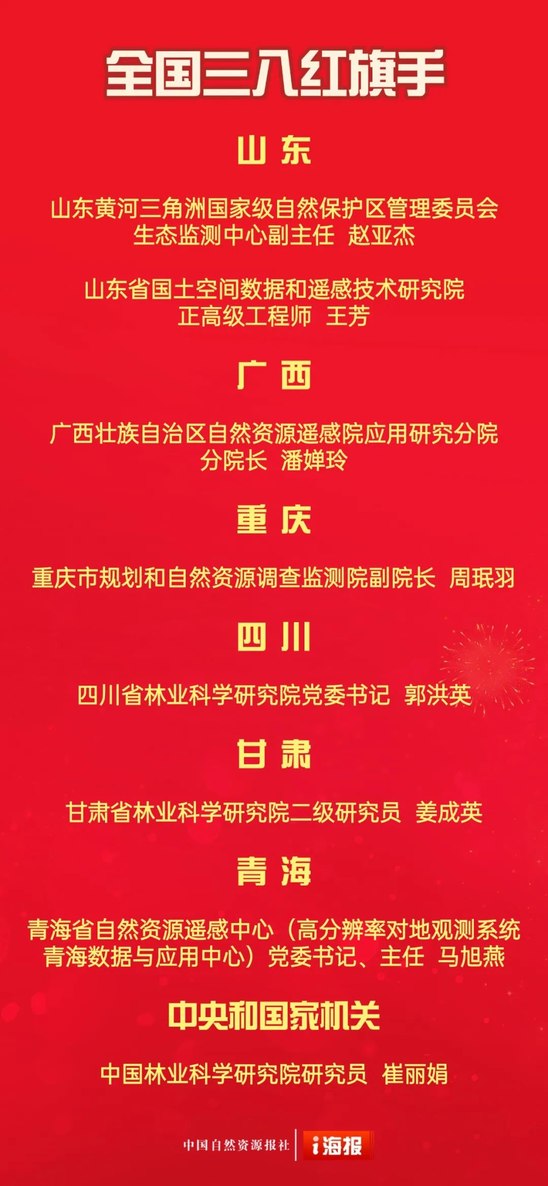 被授予全国三八红旗手称号的是:山东黄河三角洲国家级自然保护区管理委员会生态监测中心副主任赵亚杰、山东省国土空间数据和遥感技术研究院正高级工程师王芳、广西壮族自治区自然资源遥感院应用研究分院分院长潘婵玲、重庆市规划和自然资源调查监测院副院长周珉羽、四川省林业科学研究院党委书记郭洪英、甘肃省林业科学研究院二级研究员姜成英、青海省自然资源遥感中心(高分辨率对地观测系统青海数据与应用中心)党委书记、主任马旭燕,中国林业科学研究院研究员崔丽娟。