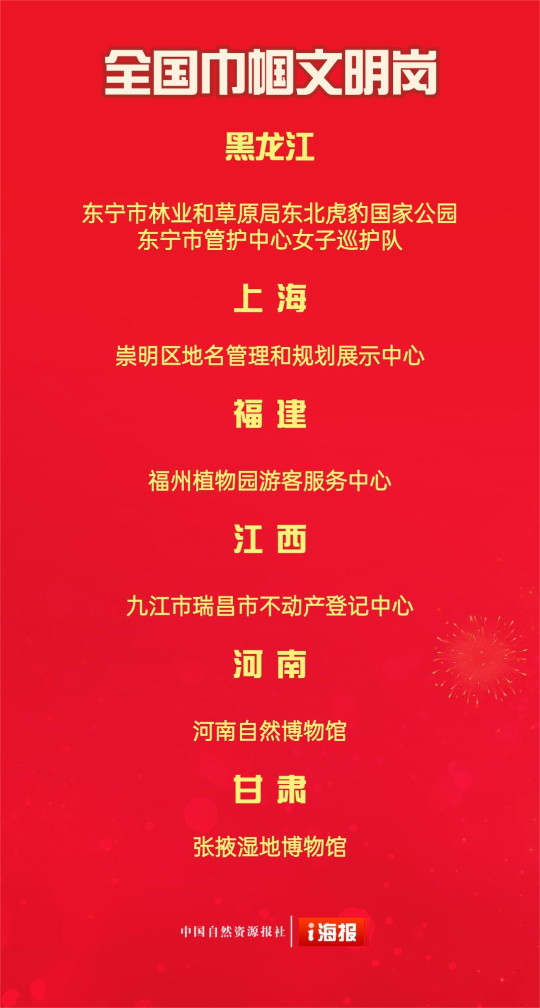 被授予全国巾帼文明岗称号的6个单位是:黑龙江省东宁市林业和草原局东北虎豹国家公园东宁市管护中心女子巡护队、上海崇明区地名管理和规划展示中心、福建福州植物园游客服务中心、江西九江市瑞昌市不动产登记中心、河南自然博物馆、甘肃张掖湿地博物馆。