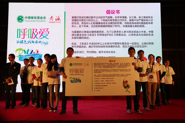 鉴于今年入冬以来全国多个城市均发生了大面积持续性的雾霾天气,启动仪式上,中国绿化基金会携手《老派》杂志特别发起“呼吸爱•PM2.5净霾运动”的倡议,号召社会公众、特别是明星和企业等一起加入植树造林、低碳环保、节俭生活等绿色行动,在全社会营造人人关注环境、支持环保的氛围,以此应对并消除雾霾天气。