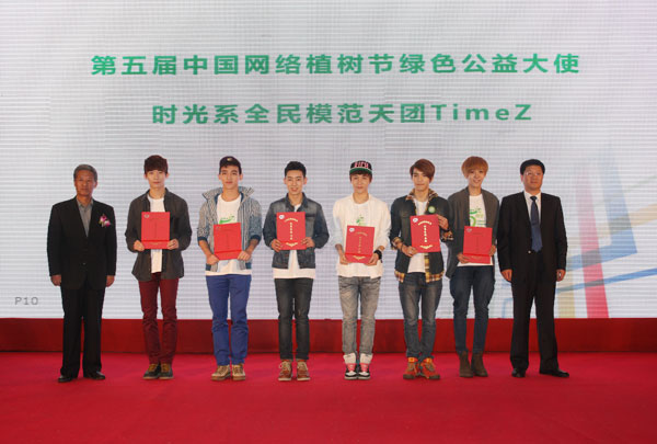 4月8日,由中国绿化基金会、联合国环境规划署、东南卫视等单位联合主办的“网络植树——助力美丽中国建设”高端对话暨第五届中国网络植树节在北京启动,青春偶像组合TimeZ组合被聘为第五届中国网络植树节绿色公益大使。