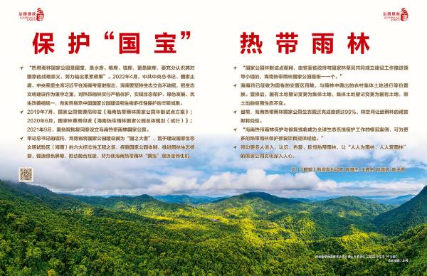 ◆ 牢记总书记的嘱托,海南省将国家公园建设视为“国之大者”,置于建设国家生态文明试验区(海南)的六大标志性工程之首,探路国家公园体制,推进雨林生态修复,锻造绿色屏障,推动融合互促,努力使海南热带雨林“国宝”重焕蓬勃生机。