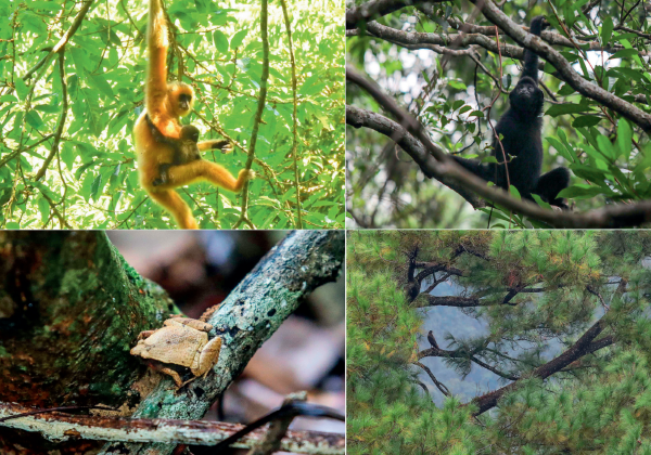 左上图为海南长臂猿B群幼猿(2021年5月摄 海南热带雨林国家公园管理局供图);右上图为海南热带雨林国家公园体制试点区霸王岭自然保护区内的海南长臂猿(2019年10月25日摄 蒲晓旭摄 / 本刊);左下图为霸王岭自然保护区内的姬蛙(2019年10月26日摄 蒲晓旭摄 / 本刊);右下图为霸王岭自然保护区内的蛇雕(2019年10月26日摄 蒲晓旭摄 / 本刊)