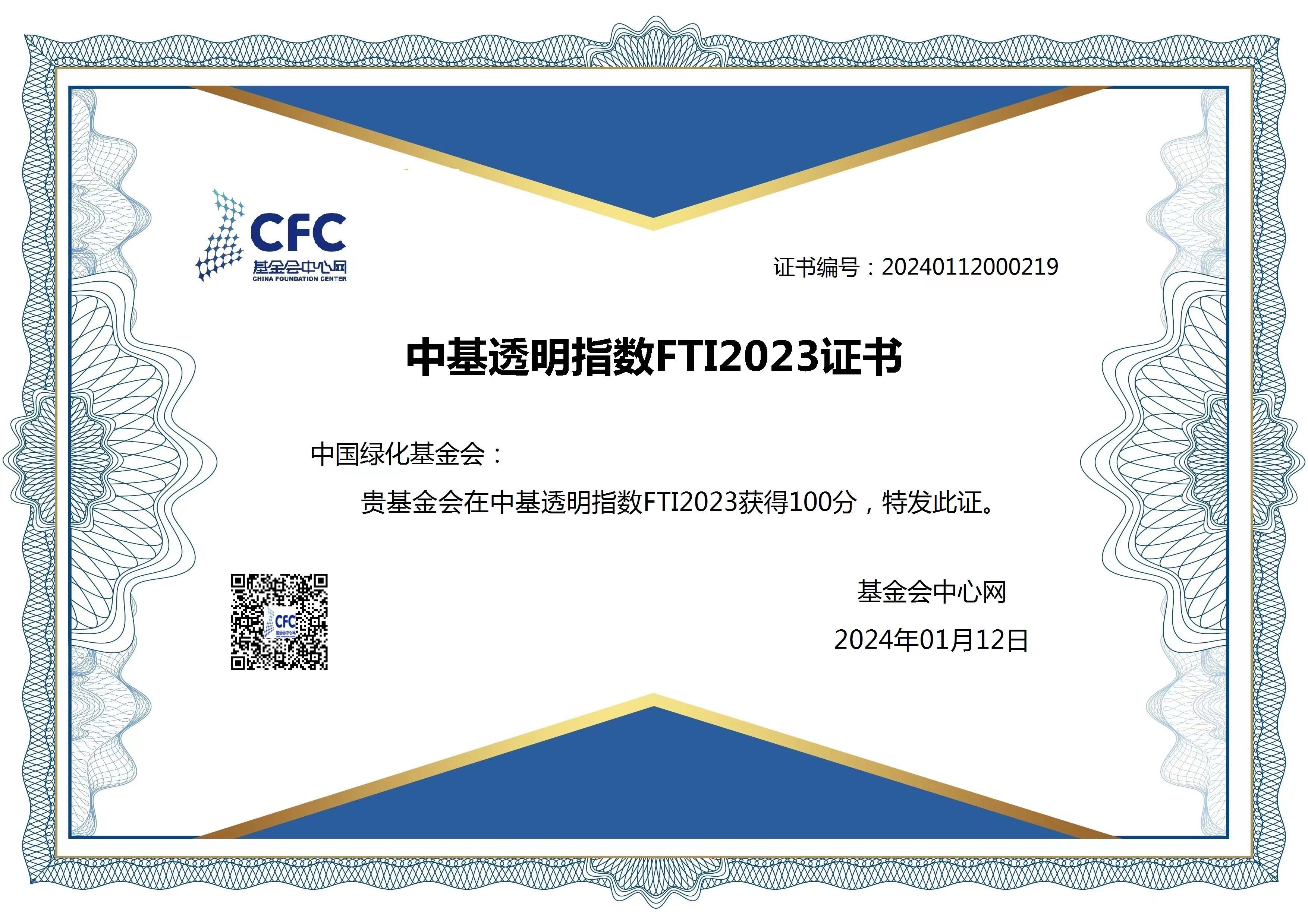 2024年1月12日,中国基金会行业在北京召开数据发布会,发布中基透明指数FTI2023榜单,中国绿化基金会荣获中基透明指数FTI满分。