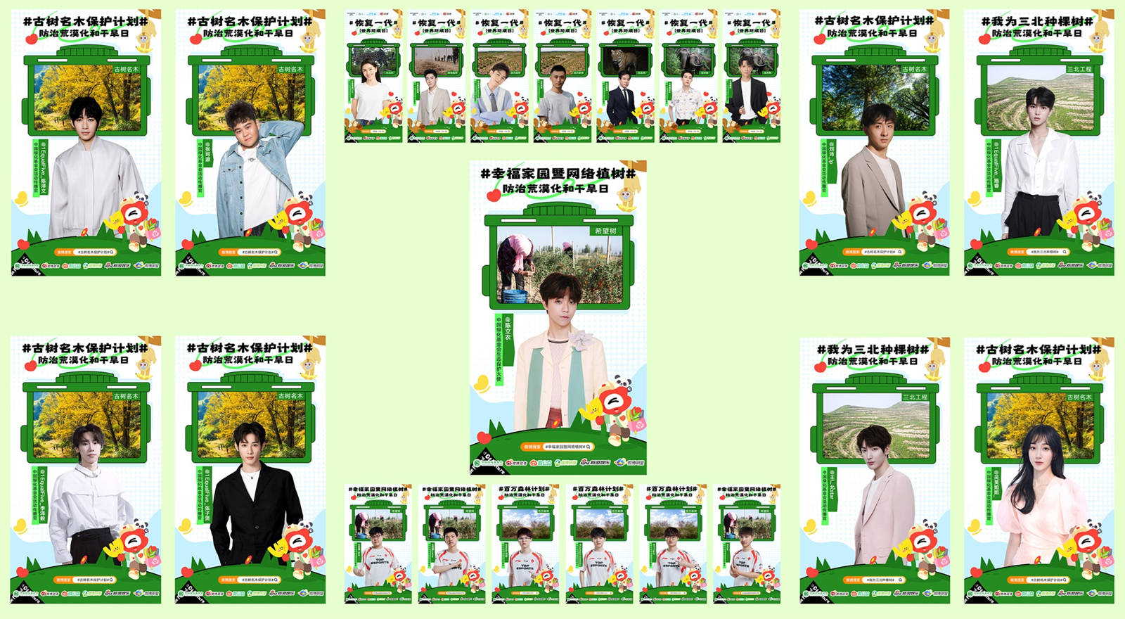 在6.5世界环境日、6.17世界防治荒漠化与干旱日期间,中国绿化基金会策划了“我为三北种棵树”、“百万森林计划”15周年—“让大地绿起来”等互联网宣传活动,邀请陈立农、张珂源、陈泽文等多名明星艺人、网络达人作为中国绿化基金会公益活动传播官,通过微博开屏、公益海报、话题互动和抖音短视频等形式,传播生态保护、绿色发展理念,倡导公众共同努力建设美丽家园。截至6月18日,微博相关话题新增阅读量886万余人次,其中#我为三北种棵树#话题在6月17日当天新增阅读量达272万余人次。