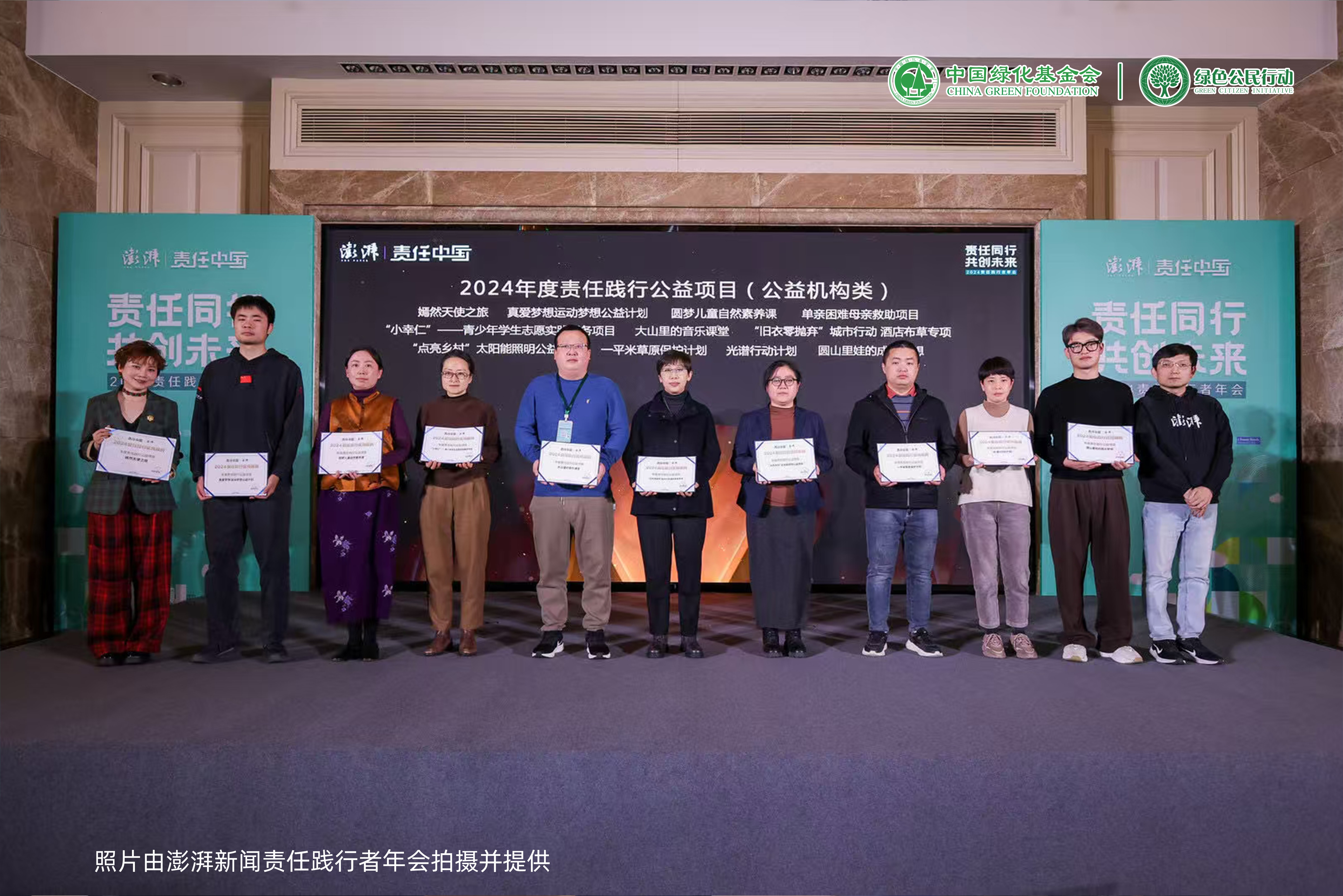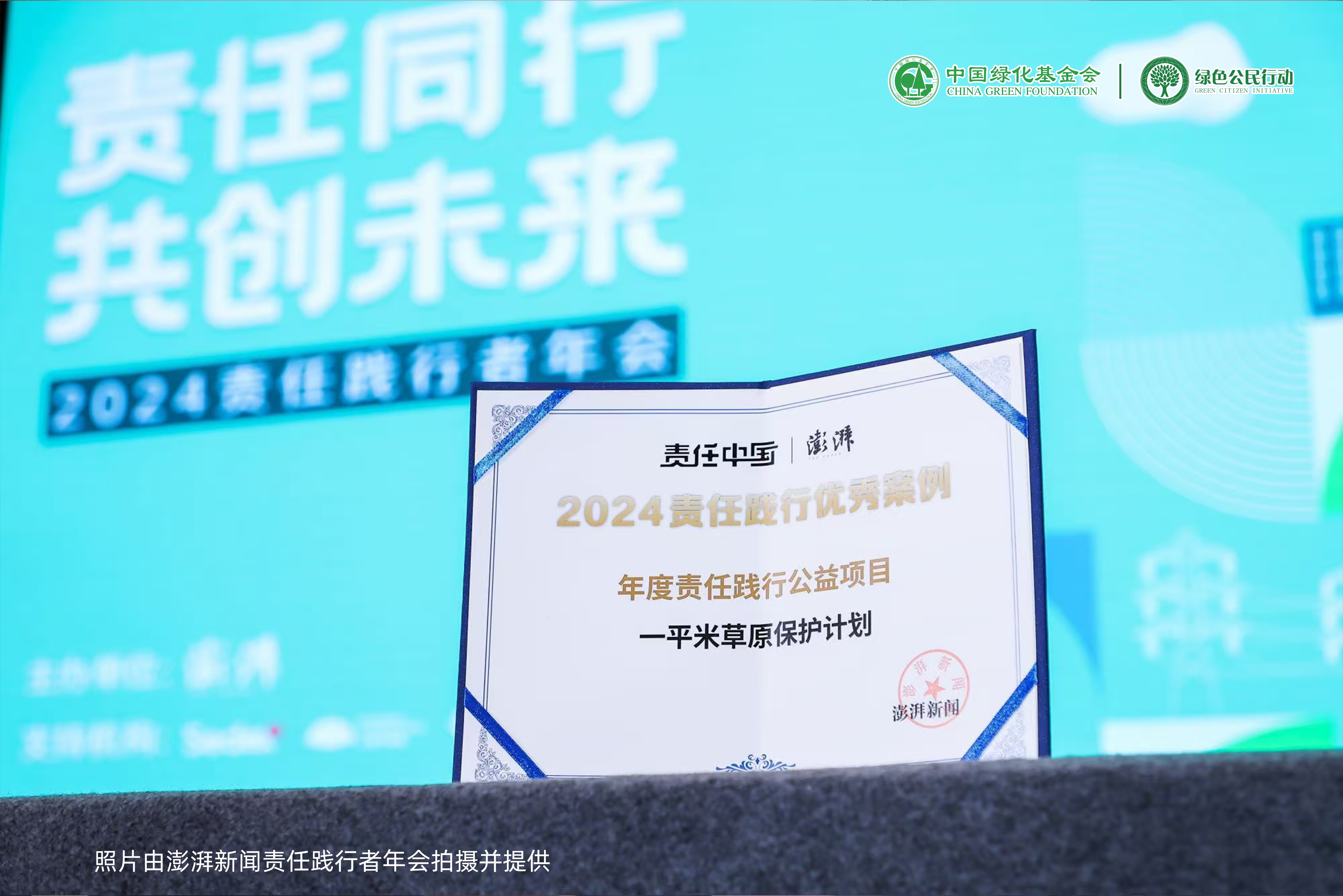 2024年12月17日,由澎湃新闻主办的2024澎湃新闻责任践行者年会在上海举办,来自政府部门、国际组织、专业机构、科研院所和重点企业的嘉宾,共同探索可持续发展的路径与创新模式。中国绿化基金会“绿色公民行动”品牌“一平米草原保护计划”公益项目凭借在推动国土绿化、改善生态环境方面所做的努力,荣获“年度责任践行公益项目”奖。