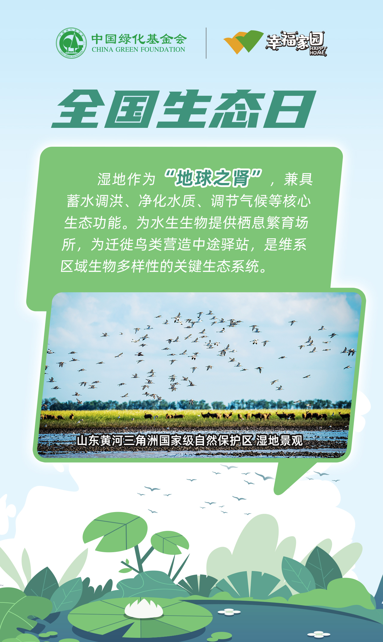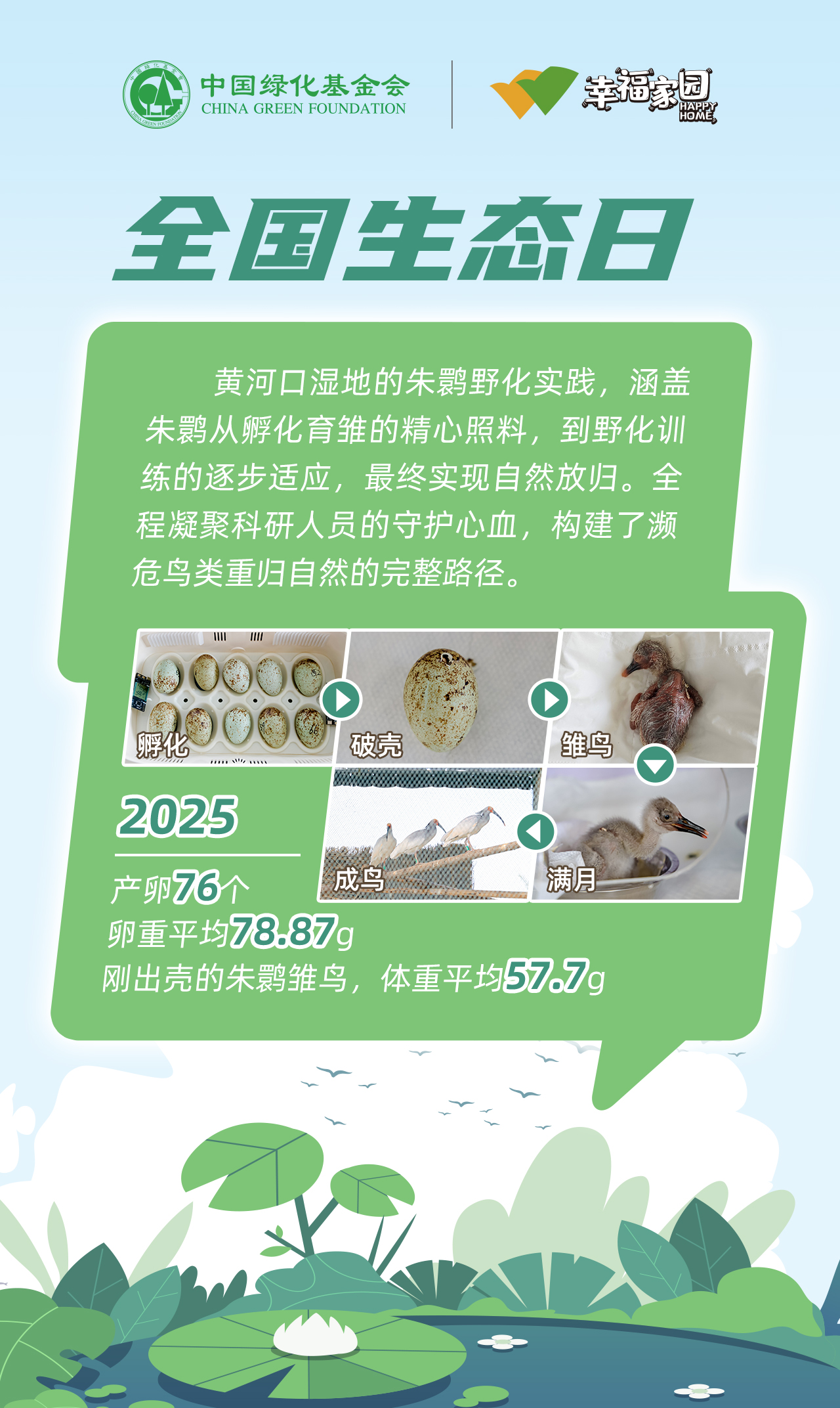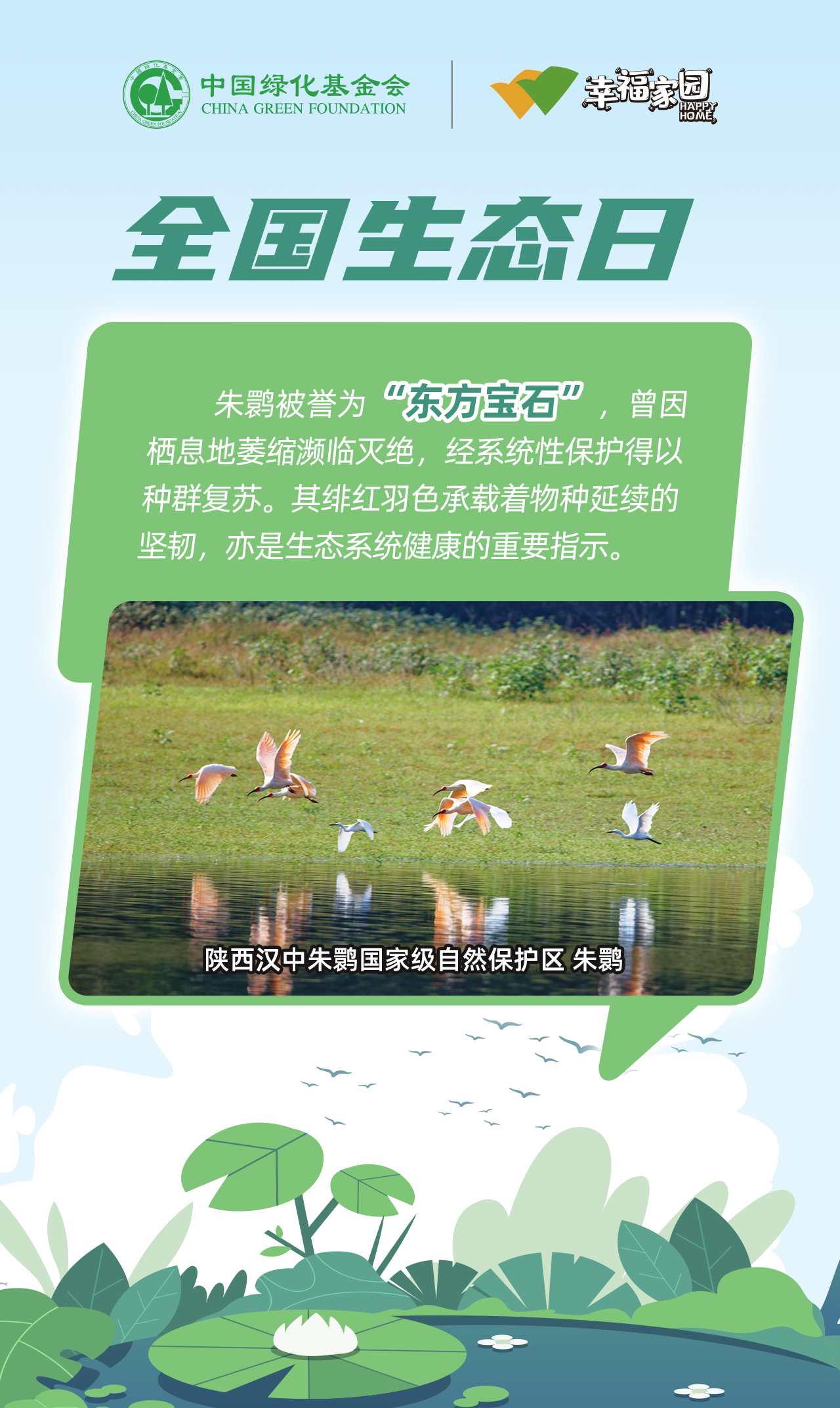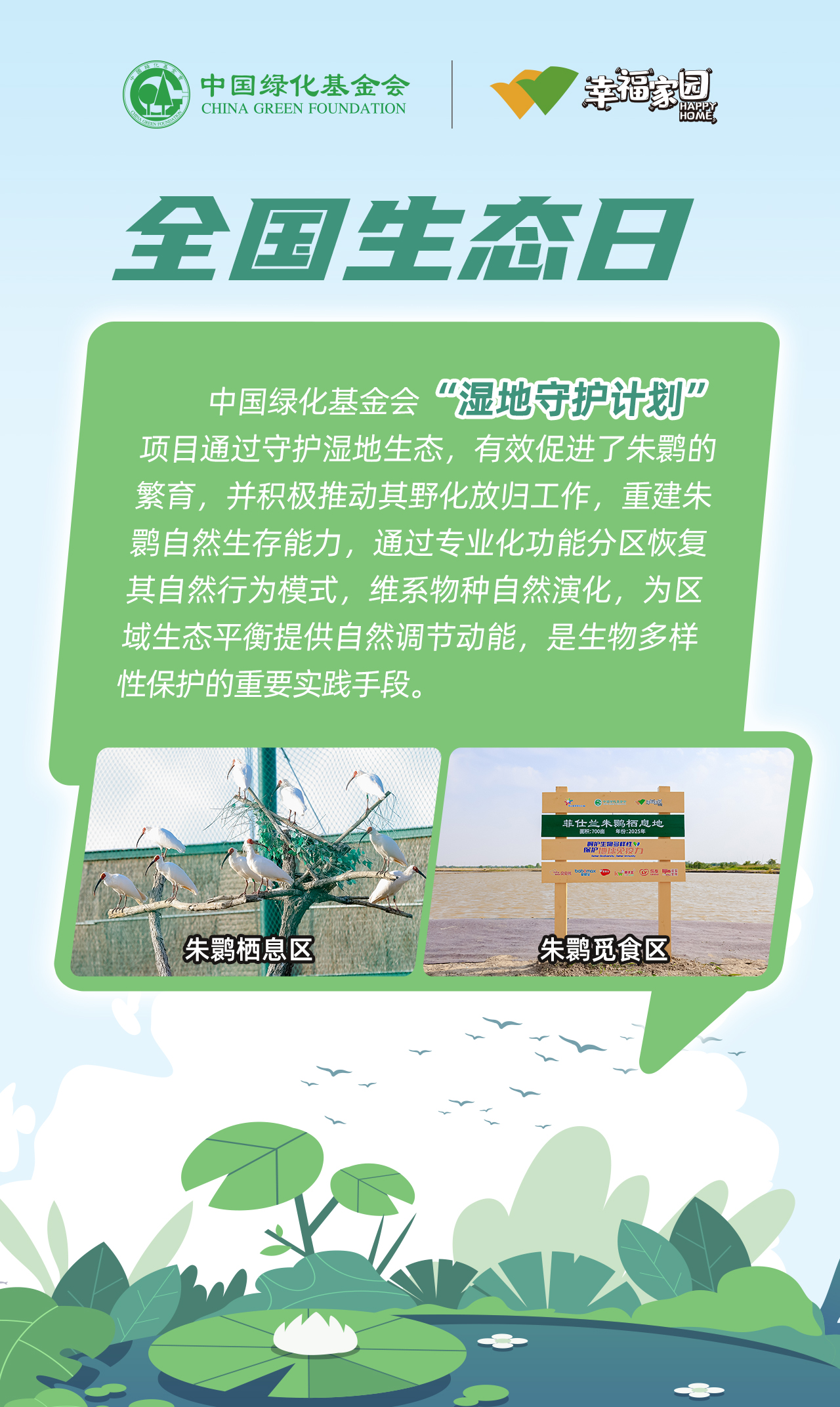 芦苇摇曳间,水鸟蹁跹处,湿地是地球馈赠的生态瑰宝。中国绿化基金会“湿地守护计划”项目,以“绿水青山就是金山银山”为指引,多年来深耕湿地修复:从净化水质到构筑生物乐园,从濒危朱鹮的人工繁育到野外种群重建,为万千飞羽筑牢栖息地。每一寸湿地的健康,都关乎生态的永续—— 今天邀您共护湿地,让万鸟齐鸣的乐章永远奏响。