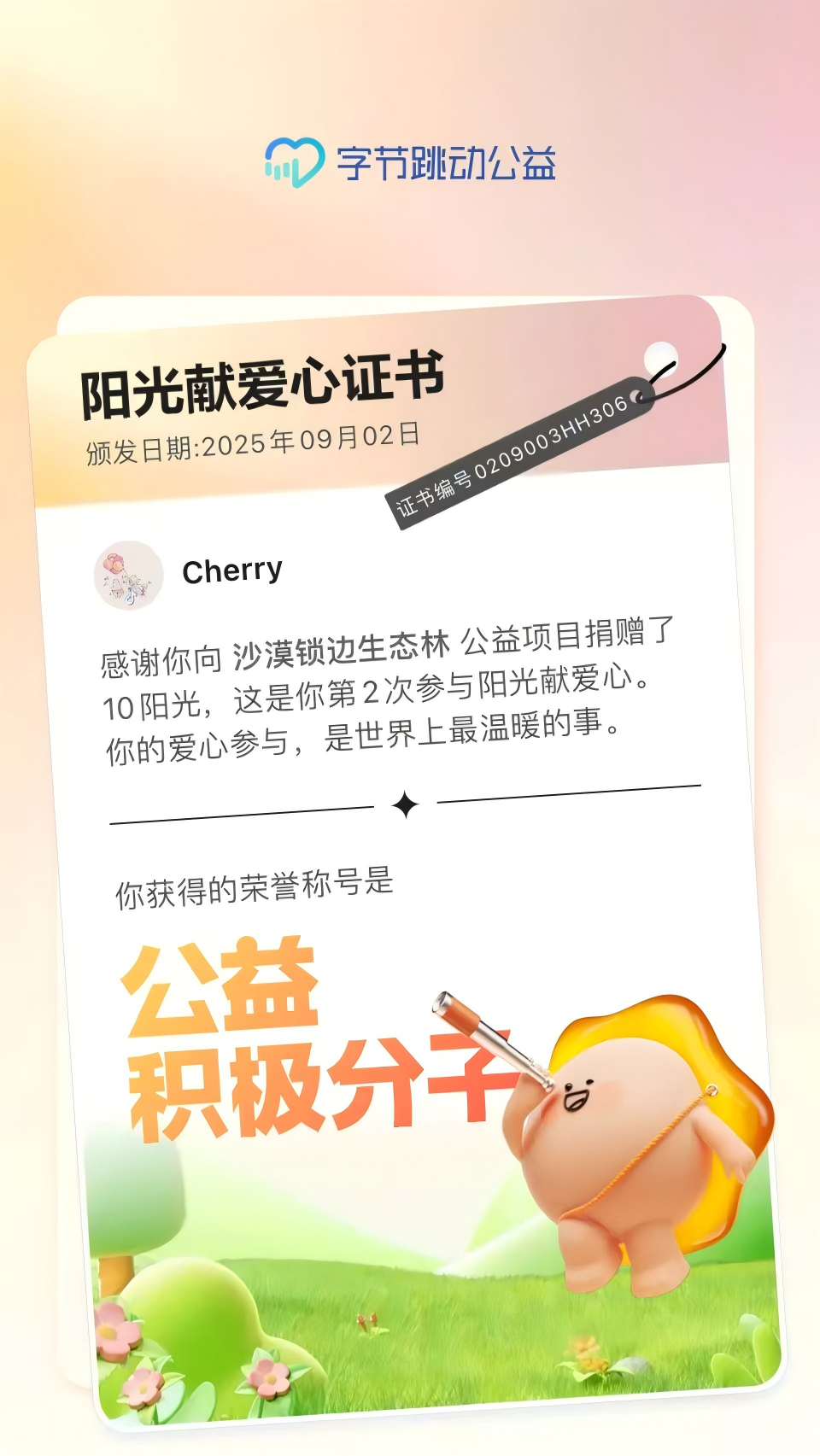 目前该项目已在字节跳动公益平台上线,用户可通过"捐阳光"方式、月捐等形式参与支持,每一份捐赠都将转化为实际种植的树苗,助力生态修复。